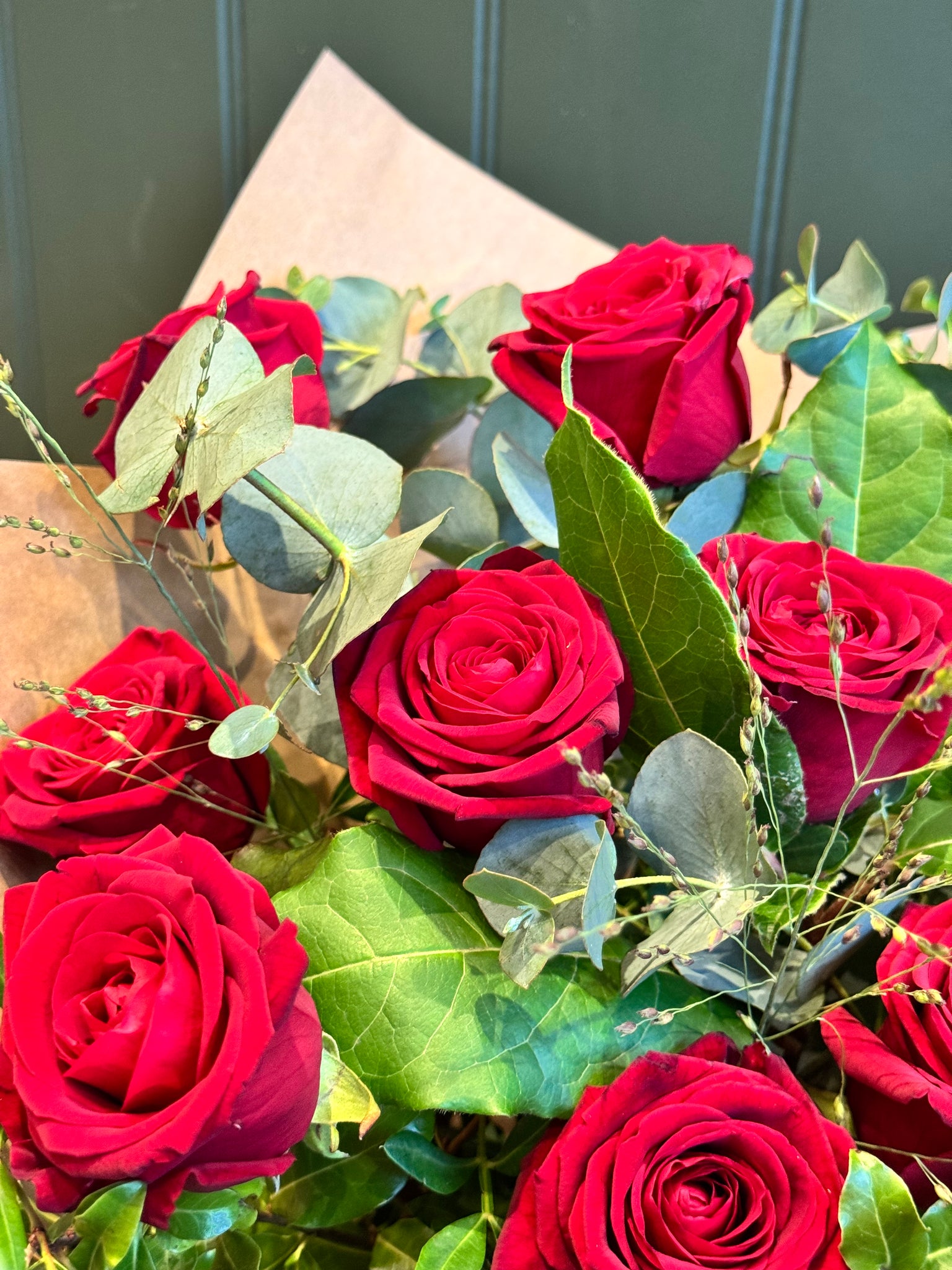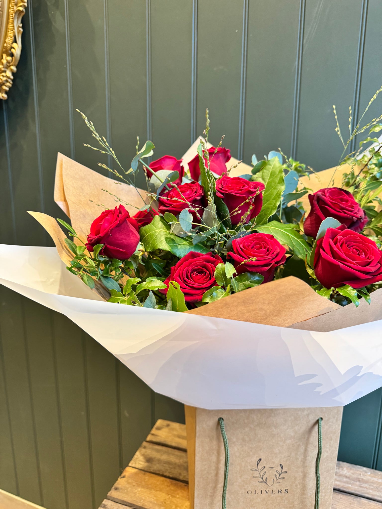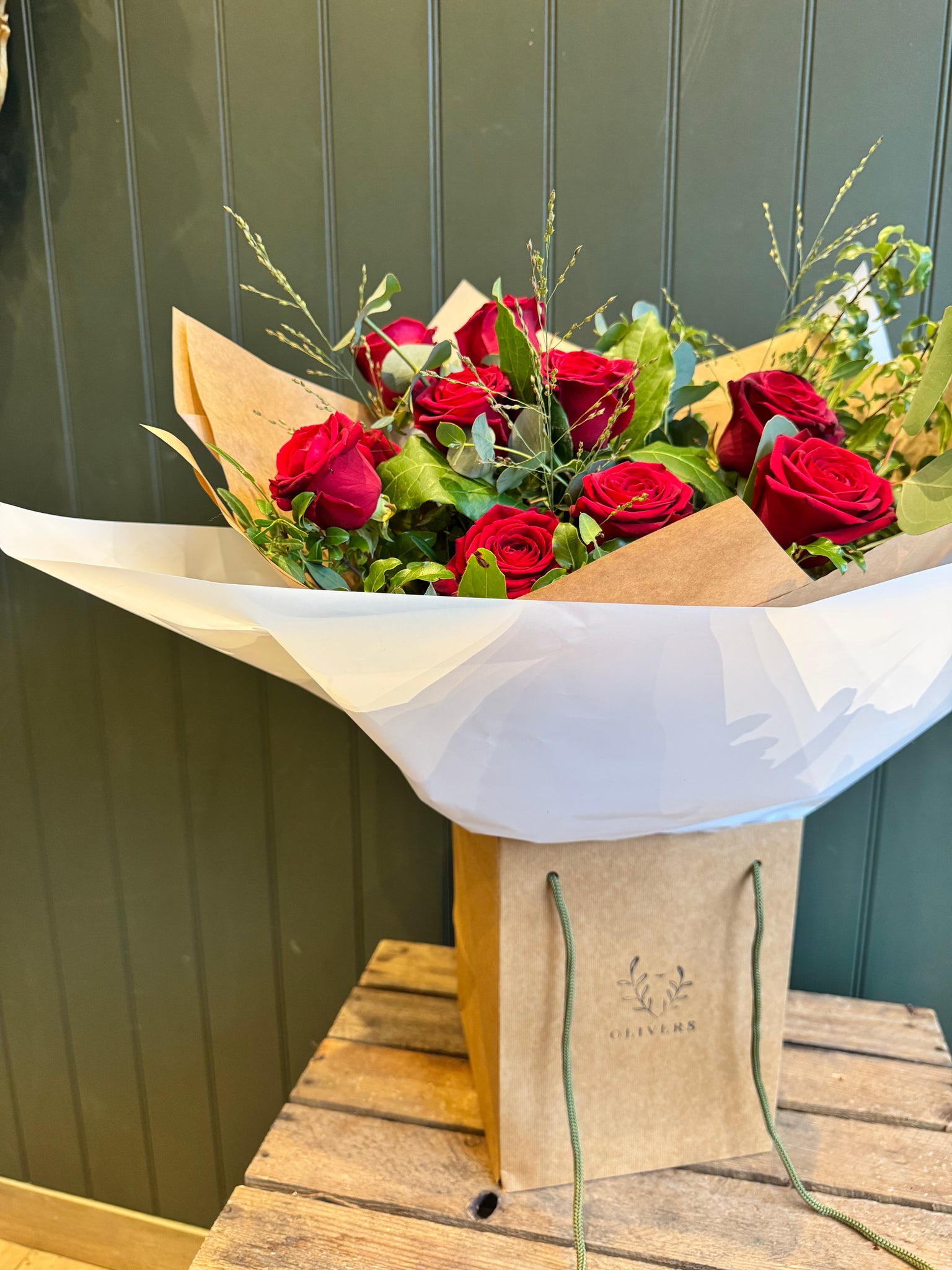 Twelve of our highest quality, large headed red roses, nestled between beautiful foliage and gift wrapped to perfection.